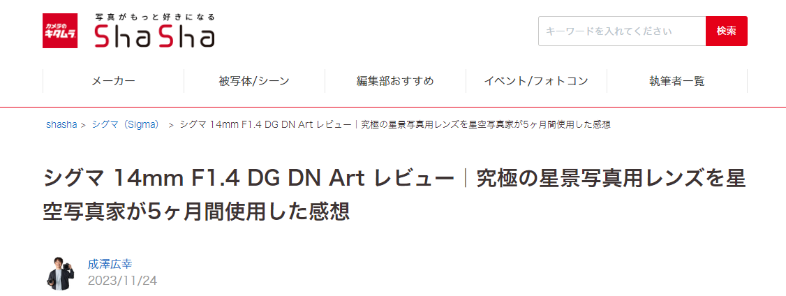 その他 OTHER 雑誌記事 「月刊天文ガイド」にて連載させていただきました。 出版社: 誠文堂新光社 2025年3月号で最終回を迎えました。ありがとうございました。 今後は不定期で特集記事を執筆させていただく予定です。 WEB記事 カメラのキタムラ「ShaSha」にてレビュー記事を掲載させていただいています(不定期)